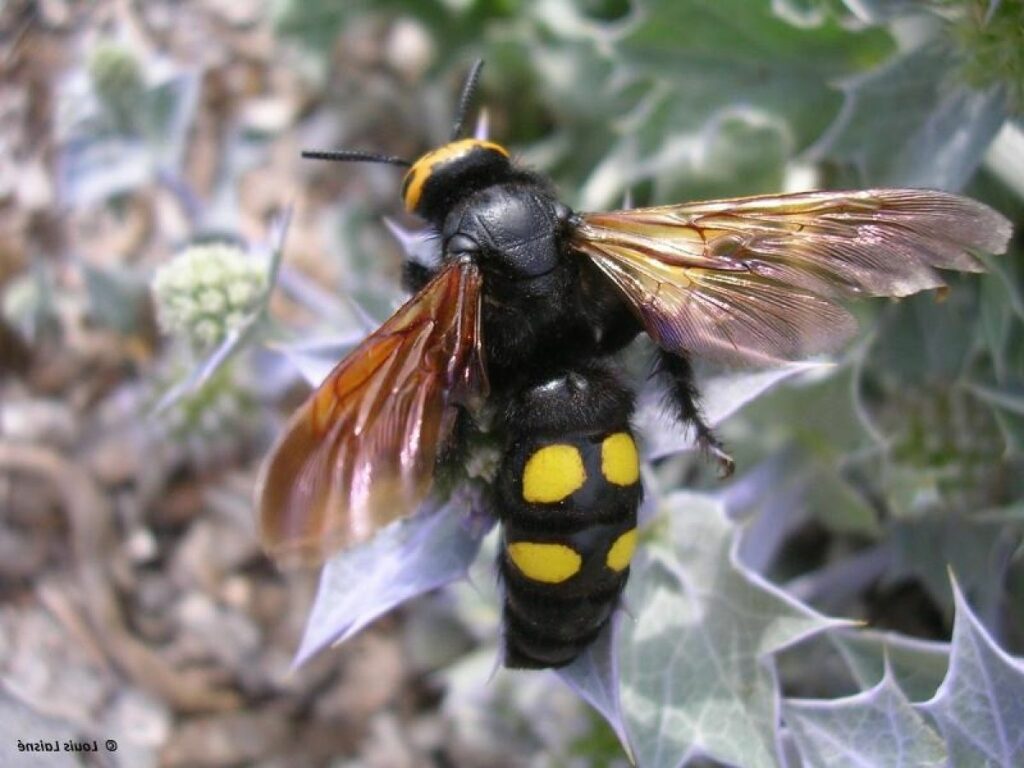 La scolie des jardins peut atteindre 4 à 5 cm de long, ce qui en fait l’une des plus grosses guêpes du continent européen. Son corps est noir brillant, marqué de deux taches jaunes sur l’abdomen, et ses ailes ont souvent une teinte brun-violet.